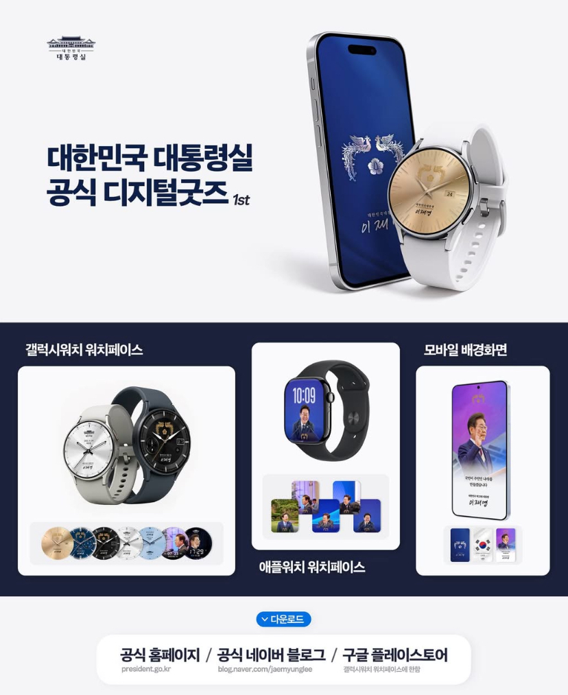 이재명 대통령 디지털 굿즈는 스마트폰 공용 배경화면 3종을 비롯해 안드로이드 스마트워치에서 사용할 수 있는 대통령 휘장(3종), 업무표장(1종), 대통령 사진(2종)으로 구성된 워치페이스 6종과 변형 디자인으로 구성됐습니다. 대통령 사진 기반의 애플워치용 배경화면도 5종이 제공됩니다.