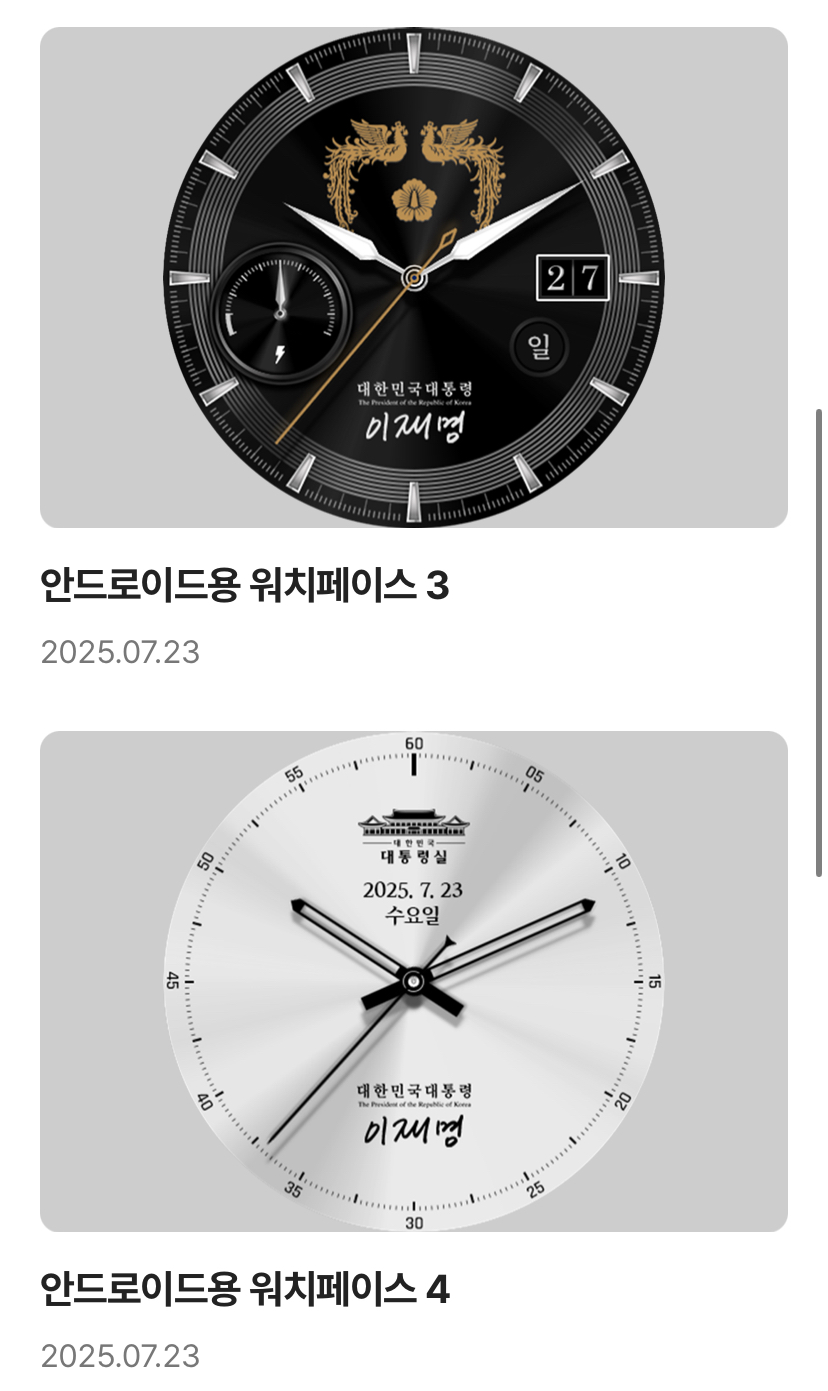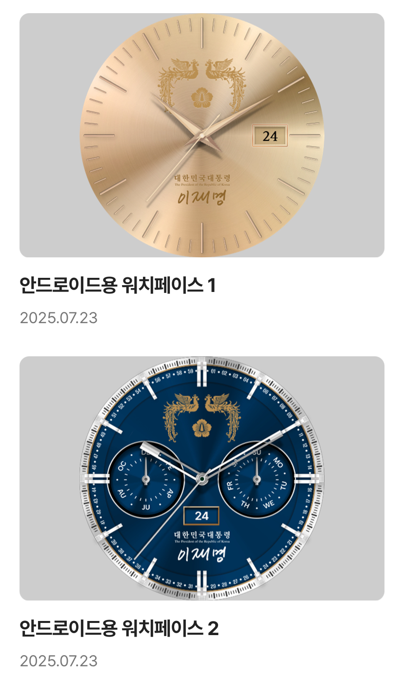 이재명 대통령 디지털 굿즈는 스마트폰 공용 배경화면 3종을 비롯해 안드로이드 스마트워치에서 사용할 수 있는 대통령 휘장(3종), 업무표장(1종), 대통령 사진(2종)으로 구성된 워치페이스 6종과 변형 디자인으로 구성됐습니다. 대통령 사진 기반의 애플워치용 배경화면도 5종이 제공됩니다.