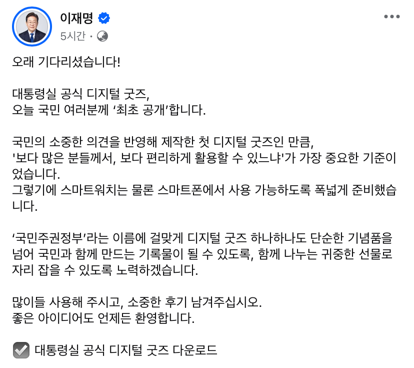 이재명 대통령은 자신의 페이스북을 통해 국민의 소중한 의견을 반영해 제작한 첫 디지털 굿즈인 만큼 보다 많은 분께서, 보다 편리하게 활용할 수 있느냐가 가장 중요한 기준이었다라며 국민주권정부라는 이름에 걸맞게 디지털 굿즈 하나하나도 단순한 기념품을 넘어 국민과 함께 만드는 기록물이 될 수 있도록 함께 나누는 귀중한 선물로 자리 잡을 수 있도록 노력하겠다고 했습니다.