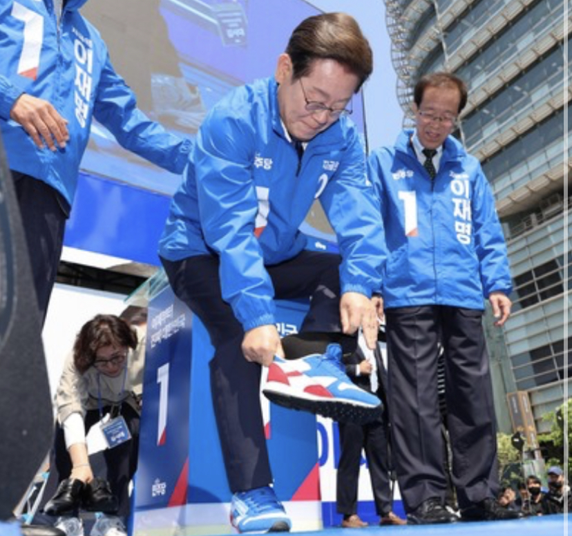 이재명 후보는 출정식 장소로 택한 서울 광화문 청계광장에 도착한 뒤 신고 있던 구두를 벗고 운동화로 갈아 신었습니다.