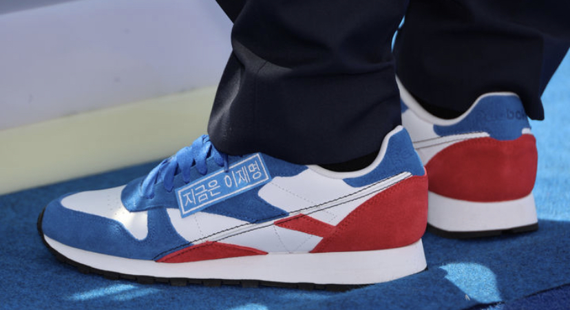 이 운동화 디자인은 민주당의 상징색인 파란색과 국민의힘의 빨간색이 반씩 절묘하게 배합돼 있습니다.