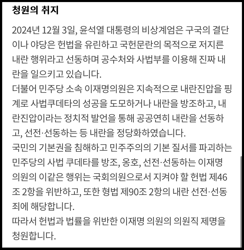 윤석열 대통령의 비상계엄은 구국의 결단이나 야당은 헌법을 유린하고 국헌문란의 목적으로 저지른 내란 행위라고 선동하며 공수처와 사법부를 이용해 진짜 내란을 일으키고 있다는 내용의 이재명 제명 청원이 국민 청원 홈페이지에 올라왔습니다. 그럼 이재명 제명 탄핵 청원 바로가기에 대해 자세히 알아보겠습니다.