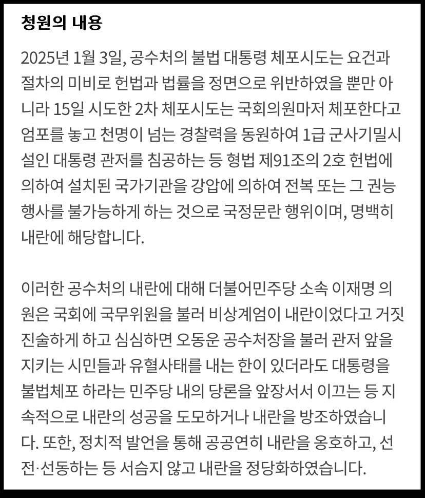 이러한 공수처의 내란에 대해 더불어민주당 소속 이재명 의원은 국회에 국무위원을 불러 비상계엄이 내란이었다고 거짓 진술하게 하고 심심하면 오동운 공수처장을 불러 관저 앞을 지키는 시민들과 유혈사태를 내는 한이 있더라도 대통령을 불법체포 하라는 민주당 내의 당론을 앞장서서 이끄는 등 지속적으로 내란의 성공을 도모하거나 내란을 방조하였습니다. 또한, 정치적 발언을 통해 공공연히 내란을 옹호하고, 선전·선동하는 등 서슴지 않고 내란을 정당화하였습니다.