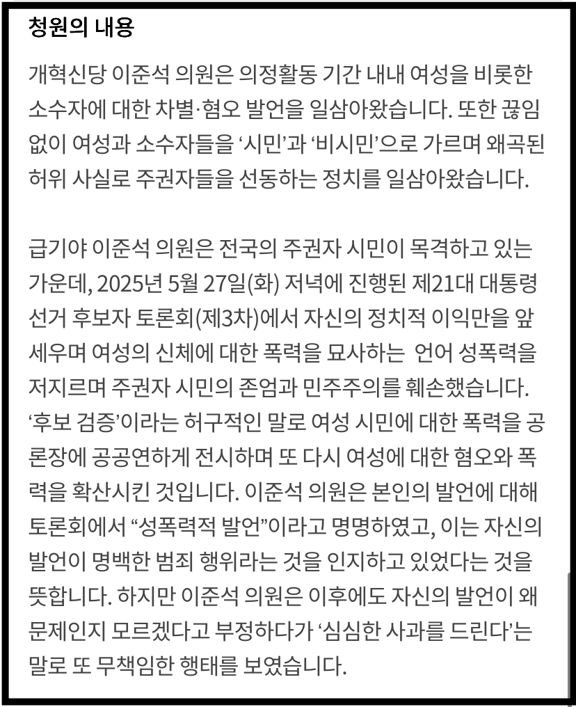 개혁신당 이준석 의원은 2025년 5월 27일(화) 진행된 제21대 대통령 선거 후보자 토론회(제3차)에서 모든 주권자 시민이 지켜보고 있는 가운데 상대 후보를 공격하기 위해 여성의 신체에 대한 폭력을 묘사하는 언어 성폭력을 저질렀습니다. 대통령 선거 후보자이자 제22대 국회의원인 이준석 의원의 해당 발화는 여성의 신체를 정치적 공격의 도구로 삼는 헌정사상 유례없는 일입니다.