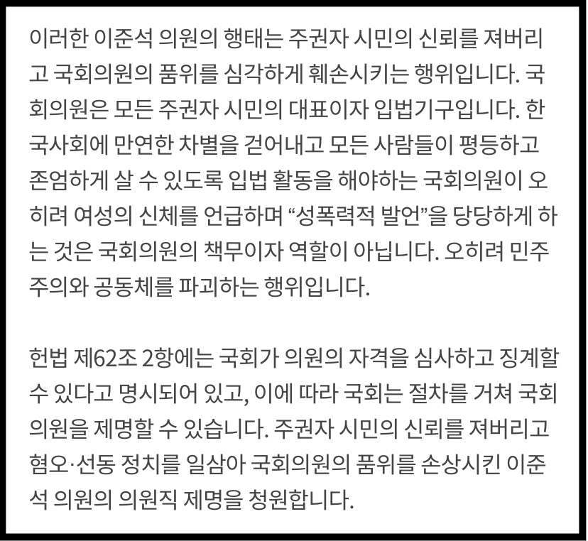 국회의원은 모든 주권자 시민의 대표이자 입법기구입니다. 이것은 곧 국회의원은 한국사회에 존재하는 소수자에 대한 차별과 혐오를 없애기 위한 입법 활동과 주권자의 존엄한 삶을 위한 활동을 해야한다는 것을 의미합니다. 이준석 의원은 대통령 선거 후보자 토론회 전에도 여성과 소수자를 끊임없이 시민과 비시민의 이분법적 구도 안에서 왜곡하는 등의 행태를 보이며 차별 선동 정치에 앞장서왔습니다. 이준석 의원이 행했던 그동안의 차별 선동 행위와, 대선 후보자 토론회에서 발화한 부적절하고 폭력적인 언어, 그리고 그 이후 자신의 행위를 정당화하는 무책임한 태도는 주권자 시민의 신뢰를 크게 저해하고 국회의원에 대한 품위를 손상하는 행위입니다.