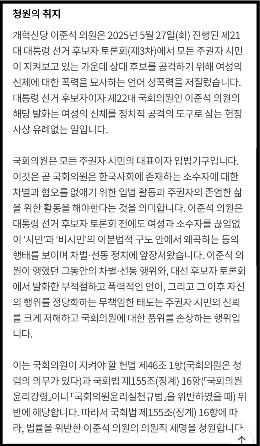 또한 국회의원이 지켜야 할 헌법 제46조 1항인 국회의원은 청렴의 의무가 있다와 국회법 제155조(징계) 16항(국회의원윤리강령이나 국회의원윤리실천규범을 위반했을 때) 위반에 해당한다면서 이준석 의원의 의원직 제명을 청원한다고 했습니다.