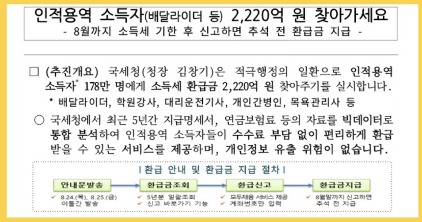 국세청에서는 배달라이더, 학원강사, 대리운전기사 등 인적용역 소득자인 178만 명에게 추석 전에 소득세 환급금 2,220억 원 찾아주기를 실시합니다. 그럼 인적용역 소득자 환급금 조회 신청방법에 대해 자세히 알아보도록 하겠습니다.