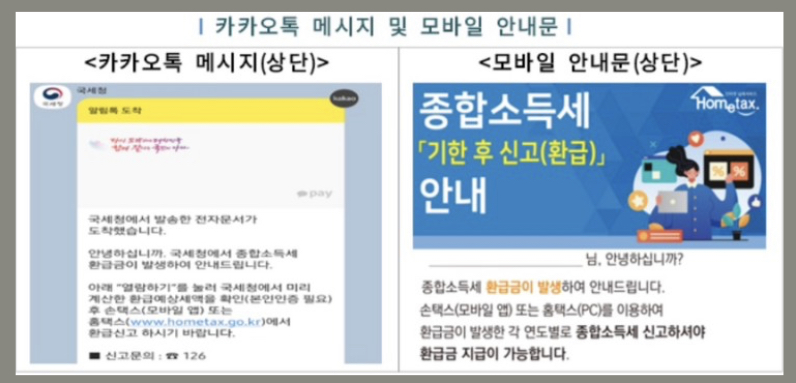 국세청에서는 납세자에게 8월 24일(목)과 25일(금)에 카카오톡으로 모바일 환급 안내문을 발송했습니다.