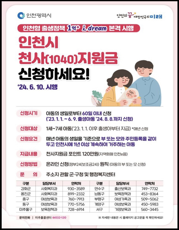 인천시에서는 1세부터 7세까지 아동에게 연 120만원을 추가로 지원하는 천사지원금이 시행됩니다. 인천시에서는 인천형 출생정책인 1억 플러스 아이드림의 일환인 천사(1040) 지원금 신청을 6월 10일부터 시작합니다. 그럼 인천시 천사지원금 신청방법 홈페이지에 대해 자세히 알아보겠습니다.