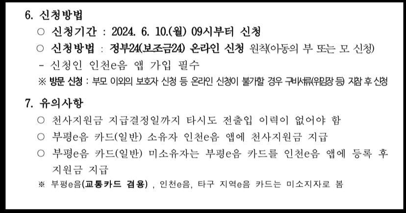 - 신청방법 : 정부24(보조금24) 온라인 신청 원칙(아동의 부 또는 모 신청)바로가기. 신청인 인천e음 앱 가입 필수