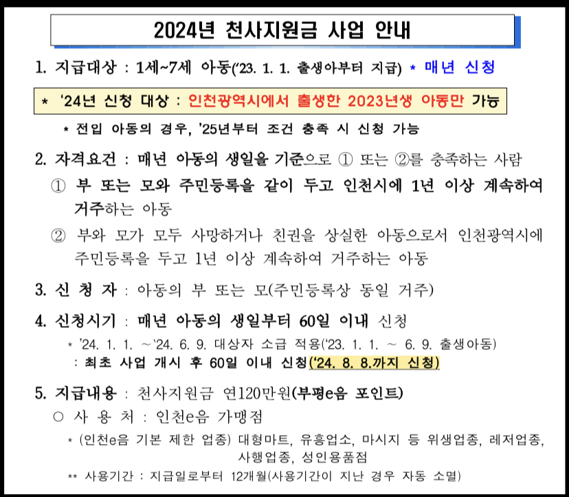 - 지급대상: 23.1.1. 이후 출생한 1세~7세 아동(매년 신청). 24년 신청 대상: 인천광역시에서 출생한 2023년생 아동만 가능. 전입 아동의 경우, ’25년부터 조건 충족 시 신청 가능