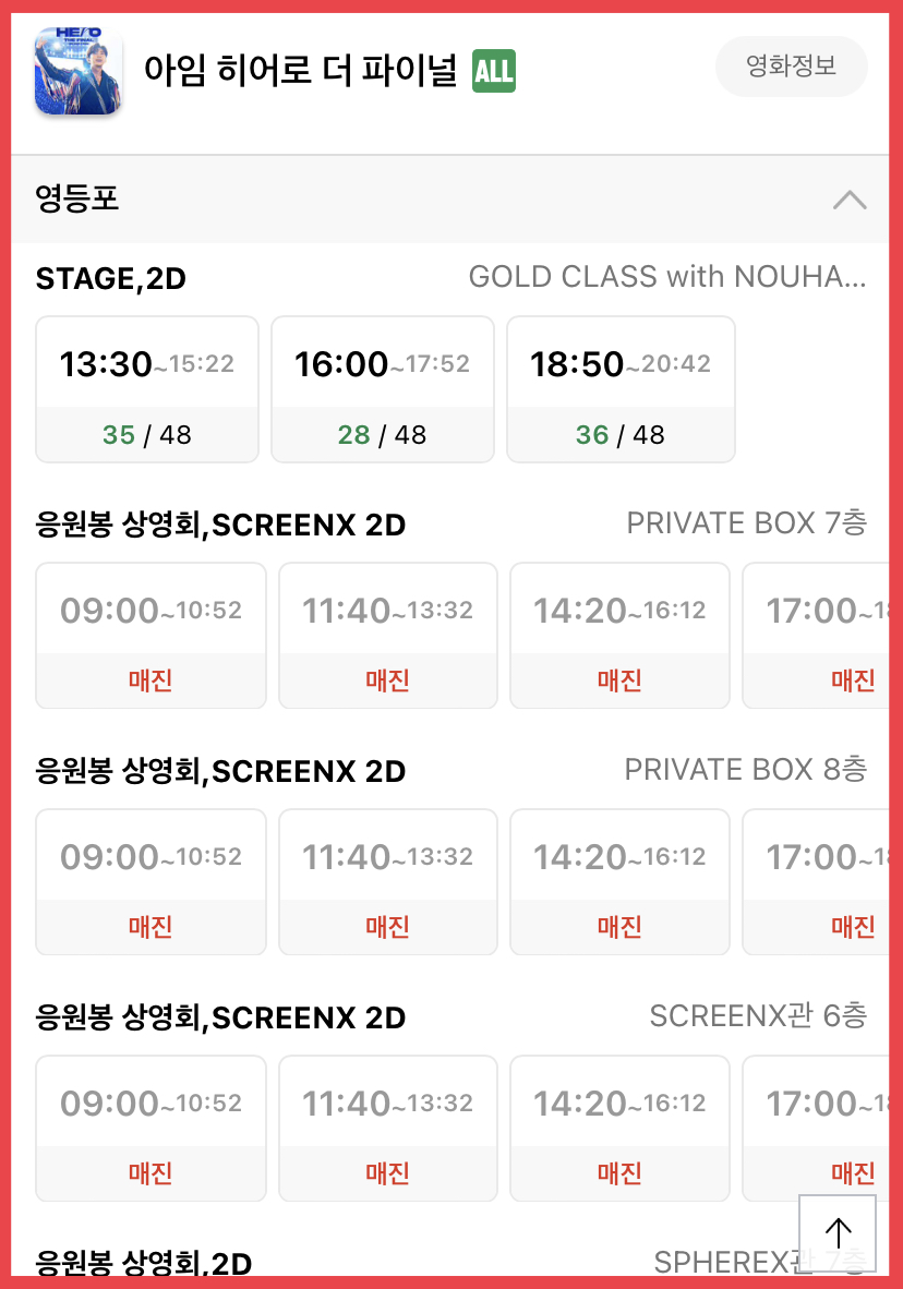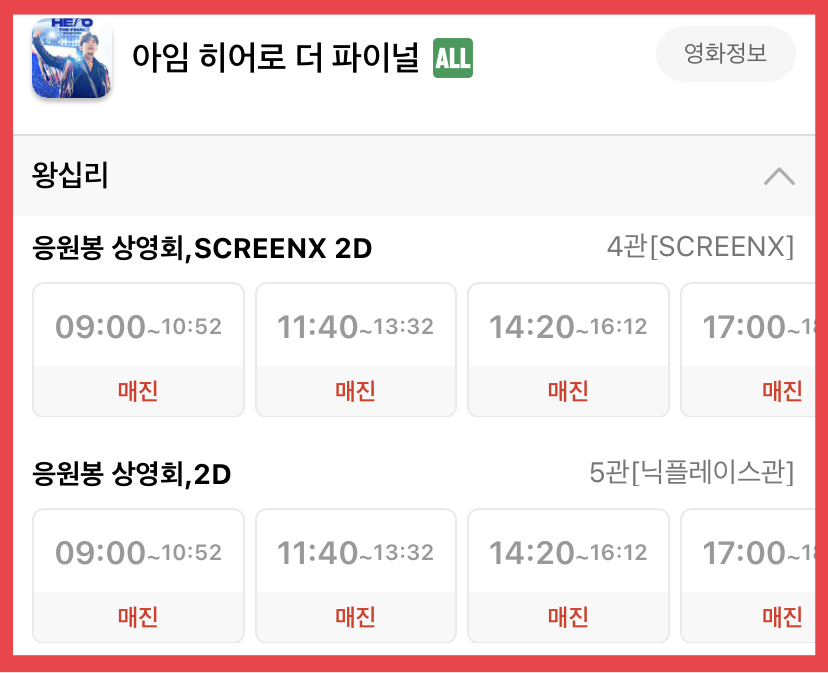 아임 히어로 더 파이널은 CGV에서 스크린X, 2D로 관람이 가능합니다. 2D 영화 예매 가격은 10,000~15,000원이고 스크린X는 12,000~17,000원 입니다. CGV 지역과 상영관에 따라 가격이 다르니 꼭 확인하시기 바랍니다.