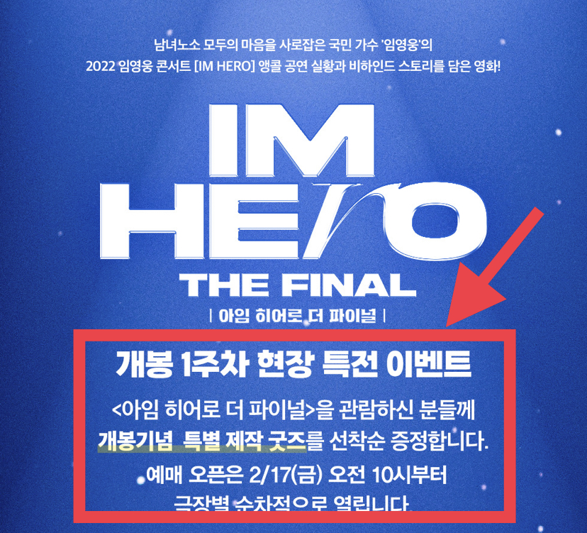 가수 임영웅의 영화 아임 히어로 더 파이널이 3월 1일 CGV 단독 개봉 합니다. 전국 투어 앵콜 공연인 IM HERO(2022.12.10-11, 고척스카이돔)를 담아낸 영화인 아임 히어로 더 파이널을 반드시 극장에서 봐야하는 이유는 콘서트의 생생한 현장은 물론이고 콘서트 준비 과정과 비하인드 스토리까지, 영웅시대와 함께한 첫 투어의 감동과 행복을 다시 한 번 느껴볼 수 있는 특별한 시간을 담아냈기 때문이라고 합니다. 그럼 임영웅 영화 아임 히어로 더 파이널 CGV 예매방법에 대해 자세히 알아보도록 하겠습니다.
