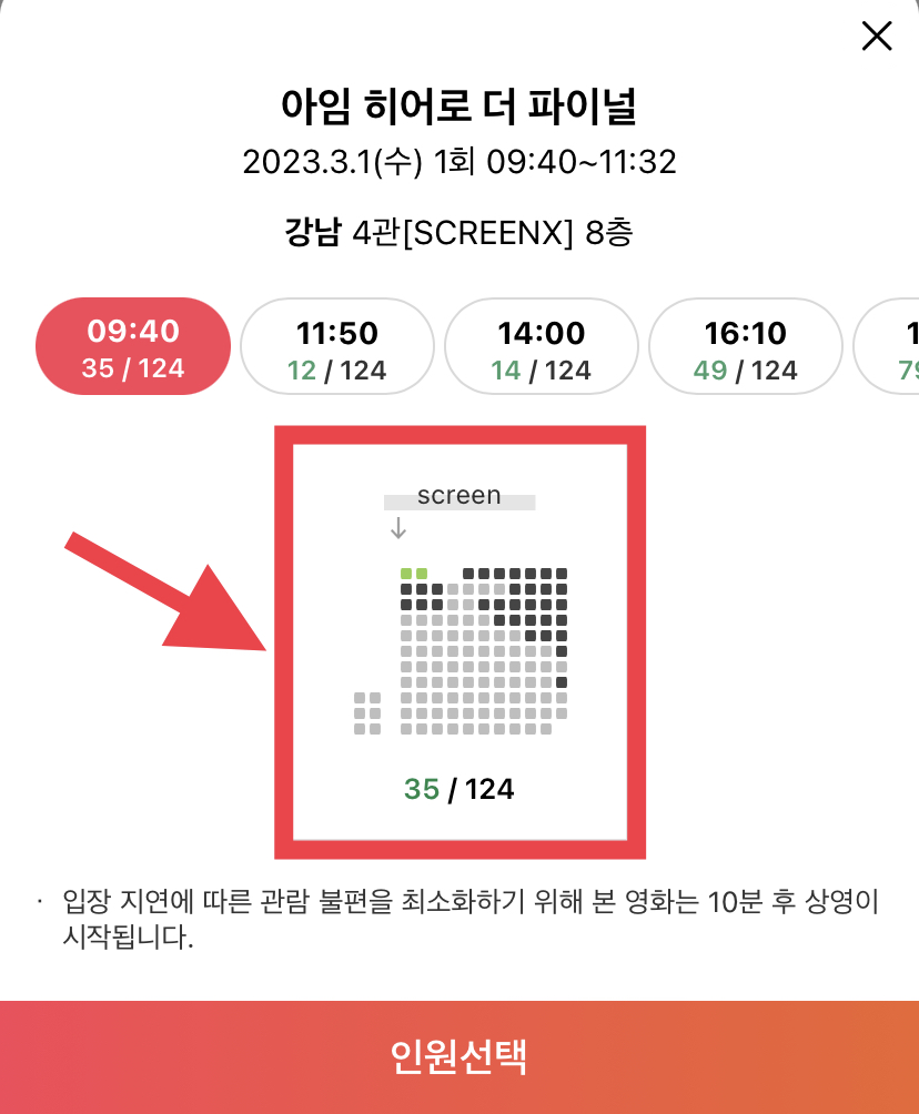 8. 시간을 누르시면 해당 상영관의 좌석이미지가 나옵니다. 까만색으로 짙게 되어있는 네모박스가 예매 가능한 좌석입니다. 인원을 선택하여 예매를 완료합니다.