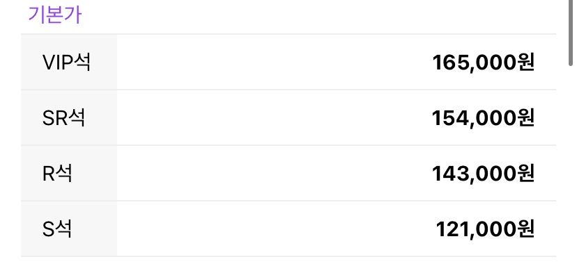 좌석 가격은 VIP석 165,000원, SR석 154,000원, R석 143,000원, S석 121,000원입니다.