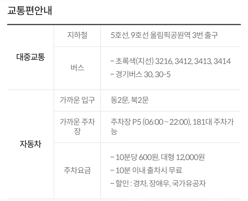 - 대중교통 지하철: 5호선, 9호선 올림픽공원역 3번 출구