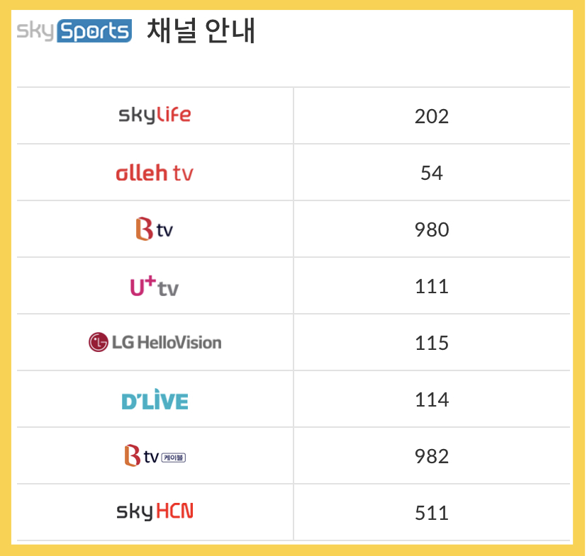 스카이스포츠의 채널번호는 스카이라이프 202, 올레tv 54, Btv 980, U+tv 111, LG헬로비전 115, 디라이브 114, Btv(케이블) 982, 스카이HCN 511입니다.