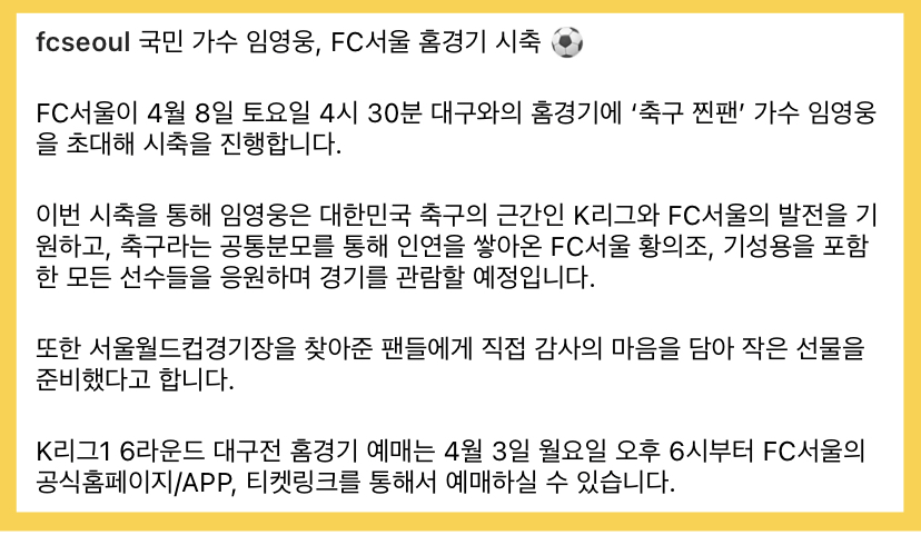 또한, 임영웅은 친분이 두터운 FC서울의 황의조 선수가 프랑스 프로축구 보르도의 소속으로 뛸 때 직접 현지까지 방문하여 응원을 한 적도 있습니다. 그리고 절친 기성용이 임영웅의 축구 동호회를 직접 찾아간 적이 있다고 하네요. 이 정도로 인연이 깊은 세 사람이기에 이번 시축이 이뤄지게 된 것 같습니다.