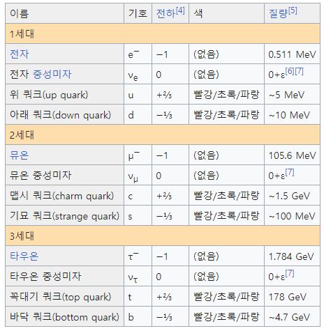 표준 모형에서 중성미자와 게이지 보손, 힉스 보존을 제외한 모든 입자는 디랙 입자로 표시됩니다. 이 입자들은 스핀 ½(즉, 페르미온)를 가지며 질량과 전하를 가지고 가져오는 사람과 다릅니다. 표준 모형은 이러한 입자의 질량을 예측하지 않지만 일반적으로 세대가 높을수록 무거워집니다. 표준 모형의 디랙 입자 중 강하게 상호작용을 하는 입자는 쿼크로 분류되는 반면 중성미자와 렙톤에 속하지 않는 입자는 렙톤으로 분류됩니다. 쿼크는 ±⅓ 혹은 ±⅔의 전하를 가지고 있고 중성미자보다는 ±1의 전하를 가지고 있습니다. 이 입자들은 힉스 메커니즘에서 질량을 얻습니다. 중성미자는 바일입자(손지기 페르미온)으로 표시됩니다. 즉, 스핀 ½(즉, 페르미온)을 가집니다. 그들은 질량과 전하가 없고 그 반입자와 다른 손지기를 가집니다. 6개의 쿼크 맛은 시간이 지남에 따라 CKM행렬의 수학적 대상으로 표시되는 다른 쿼크에 따라 달라질 수 있습니다. 이것은 이탈리아의 니콜라 카비보와 일본의 고바야시 마코토와 마스크, 히가시 히토에 의해 소개되었는데 예를 들어 중성자가 양성자로 붕괴할 수 있는데 이 과정에서 다으 ㅁ쿼크는 쿼크 혼합 때문에 CP 대칭을 보존하지 않습니다. 렙톤은 표준 모형에서는 섞이지 않으며 이는 3개의 렙톤인 전자 수, 뮤온서, 타오 온수를 별도로 보존합니다. 표준 모형의 페르미온은 각 세대의 해당 입자가 질량을 제외하고 같은 특성이 있는 3세대로 나뉩니다. 표준 모형은 생성 구조가 존재하는 이유를 설명할 수 없습니다.