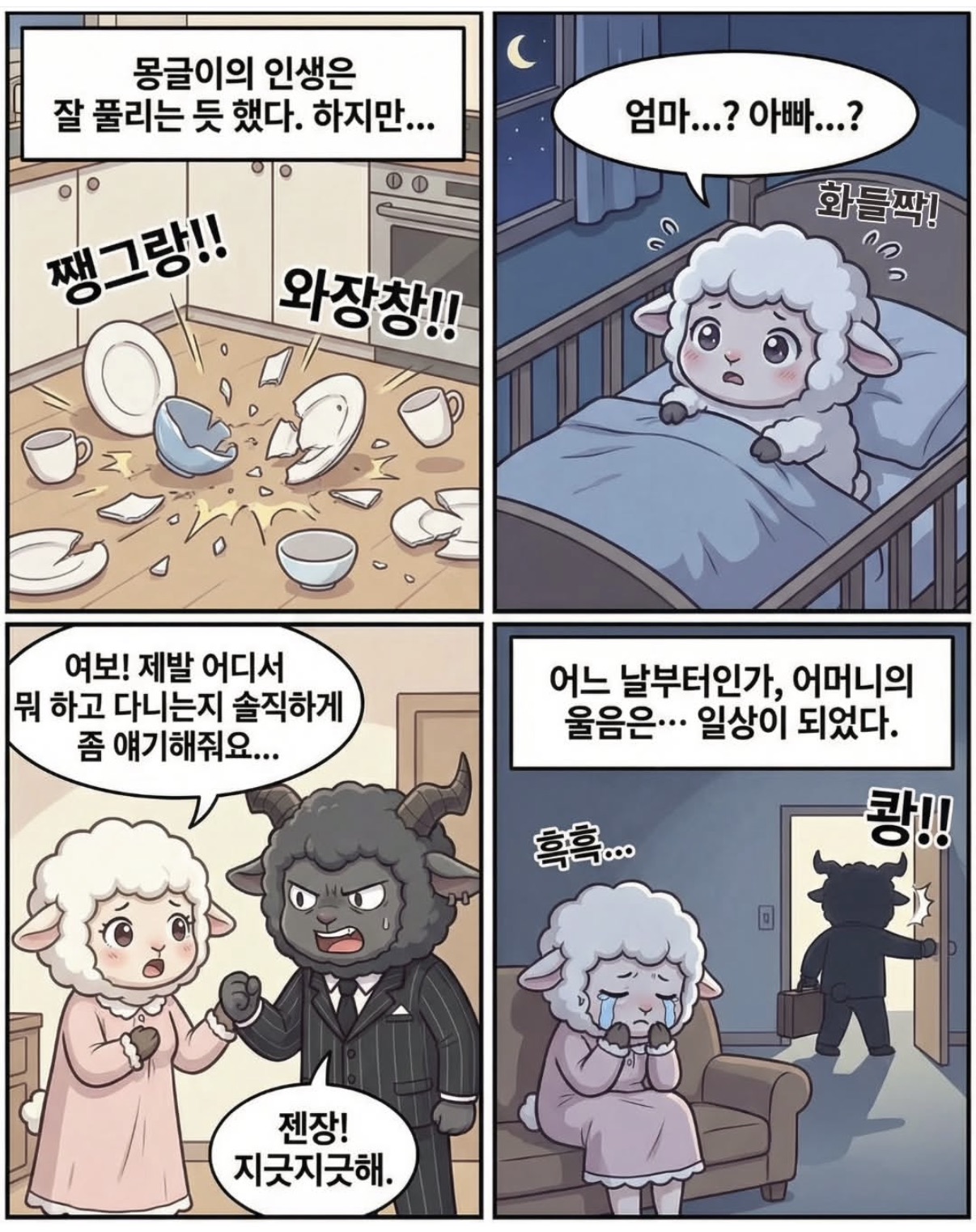 웹툰은 몽글이가 태어나고, 어느 날부터 어머니의 울음이 일상이 되는 장면으로 시작됩니다.