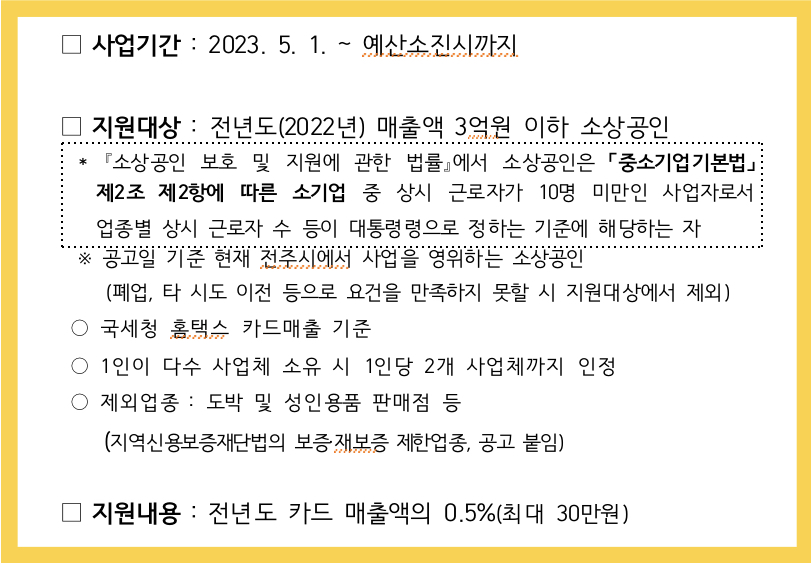 • 2022~2023년 전주시 내에서 공고일인 4월 3일까지 사업을 영위하고 있어야 합니다.