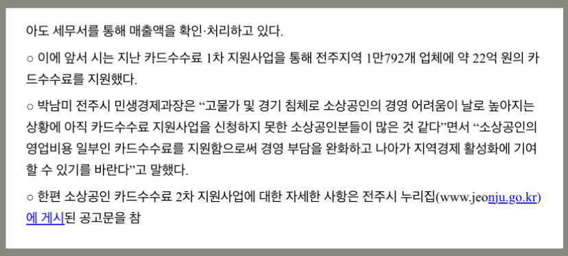 10월 17일 전북 전주시에서는 소상공인분들께 최대 30만원의 카드 수수료 지원 내용에 대해서 발표했습니다.