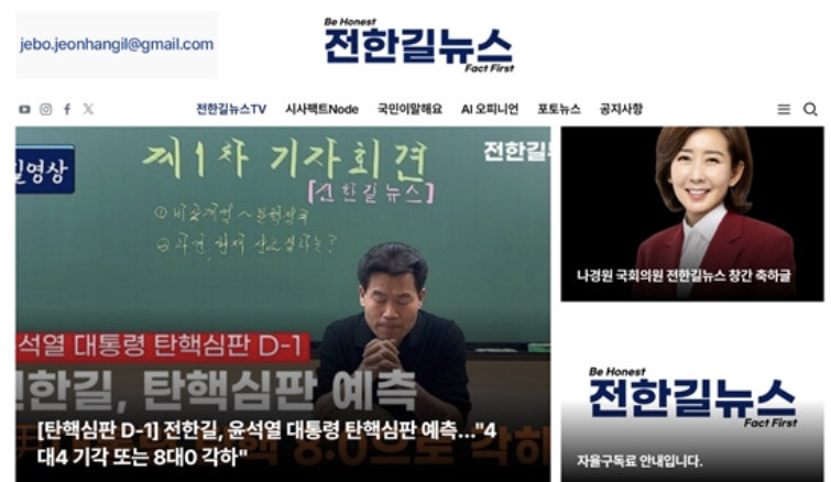 한국사강사 전한길이 창간한 언론 전한길뉴스가 개설한 홈페이지를 두고 국민의힘 중진 의원들이 축사를 보내기도 했습니다. 윤상현, 나경원 국민의힘 의원, 윤석열 대통령 탄핵심판대리인인 김계리 변호사 등이 축사를 보냈는데요.