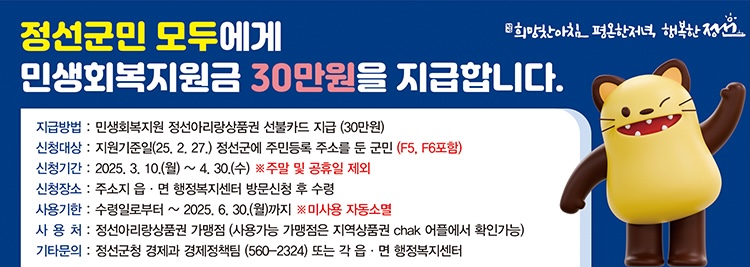 • 지원대상 : 지원 기준일인 2025년 2월 27일 정선군에 주민등록을 둔 전 군민(국적미취득 결혼이민자, 영주권자 포함)