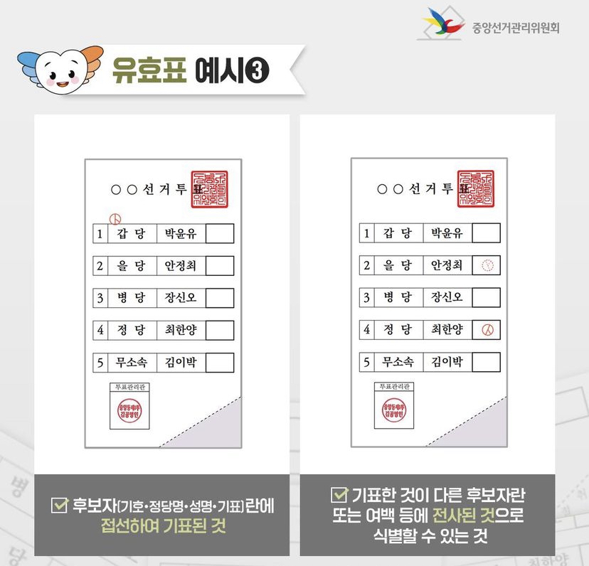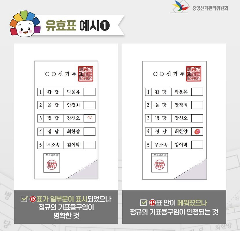 투표를 하실 때 유효표인지 무효표인지 구분이 안가시는 분들을 위해 유효표가 될 수 있는 예시를 보여드리겠습니다.
