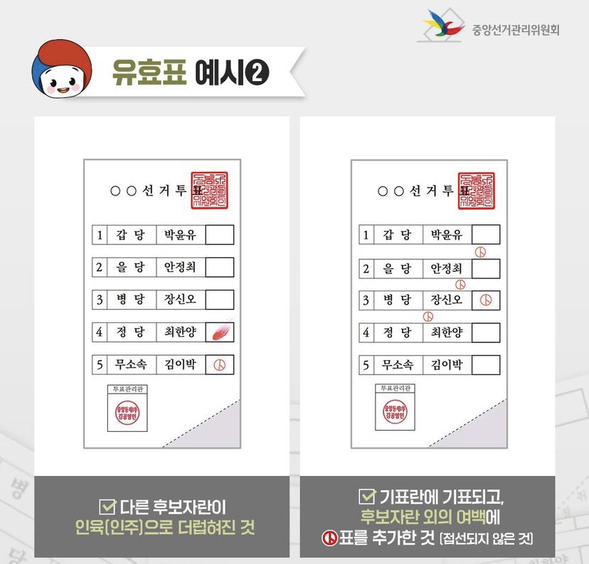 다른 후보자란이 인육으로 더럽혀진 것과 기표란에 기표되고 후보자란 외의 여백에 기표를 추가한 것입니다.