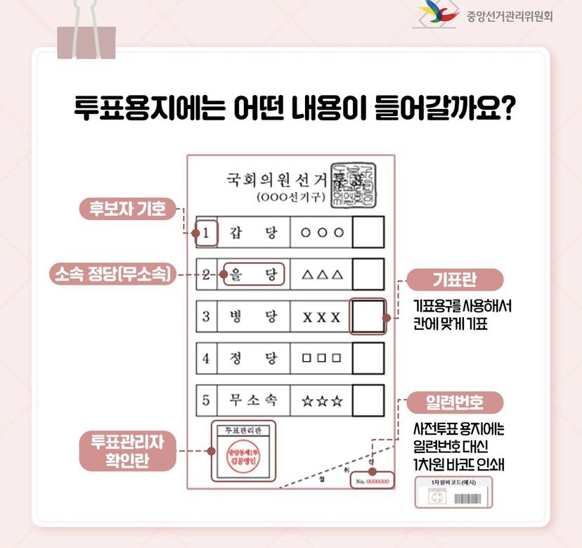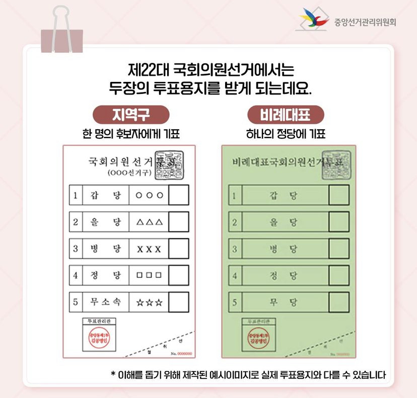 제22대 국회의원선거 투표에서는 투표용지를 두 장 받게 됩니다. 투표용지는 잘못하면 무효/유효표로 처리될 수 있기 때문에 내용을 미리 참고하시면 좋을 것 같습니다.