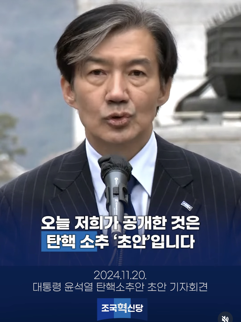 조국 대표는 조국혁신당이 앞장서 탄핵소추 초안을 공개한 이유는 무도하고 무책임하고 무능한 검찰독재 정권과 김건희 여사가 이끌고 무속인이 뒤에서 미는 윤석열 정권을 조기 종식할 골든 타임을 놓쳐서는 안 되기 때문이라고 말하며 조국혁신당은 헌법을 지키기 위한 최후의 수단으로 탄핵을 제대로 추진하기 위해 사실과 논리를 탄탄하게 쌓고 갖춰 나갈 것이라고 했습니다.