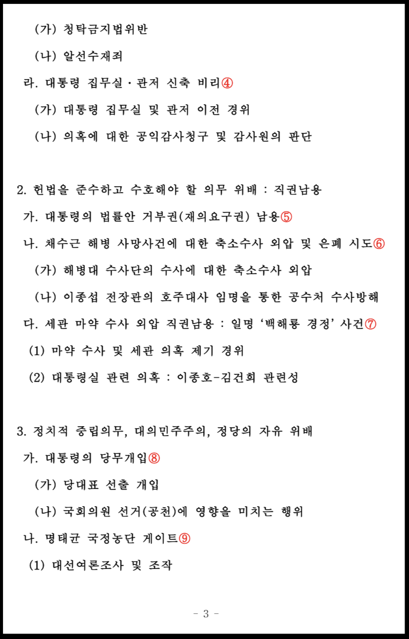 (가) 헌법위반 대통령의 성실한 직책수행 의무(헌법 제7조 제1항), 정치적 중립(제7조 제2항), 공익실현의무(제69조), 정당민주주의 위반 (나) 법률위반 공직자윤리법 제2조의 2 제3항(사적이익 추구, 부정특혜 금지), ② 부패방지권익위법(제2조. 제4호 가목), 3 특정범죄 가중처벌등에관한법률 제2조 제1항 제1호, 형법 제129조, ④ 공직선거 법 제57조의 6 제2항(공무원등의 당내경선운동금지), ⑤ 공직선거법 제86조 제1항 제2호(공무원 등의 선거관여 금지), 6 공직선거법 제47 | 조의2 제1항(정당의 후보자추천 관련 금품 수수 금지) 위반, ⑦ 공직 선거법 제96조 제1항(허위논평•보도 금지), 8 형법 제314조 제1항, 제313조 위계에 의한 정당(국민의힘) 경선 업무방해, 9 정치자금법 제32조 제1호(특정인 후보자 추천 관련 정치자금 수수금지), 00 정치자 |금법 제45조 제1항(정치자금 부정수수 금지), 11 국가공무원법 제59조 (성실의무), 12 국가공무원법 제61조(청렴의 의무) 등 중대 위반!)