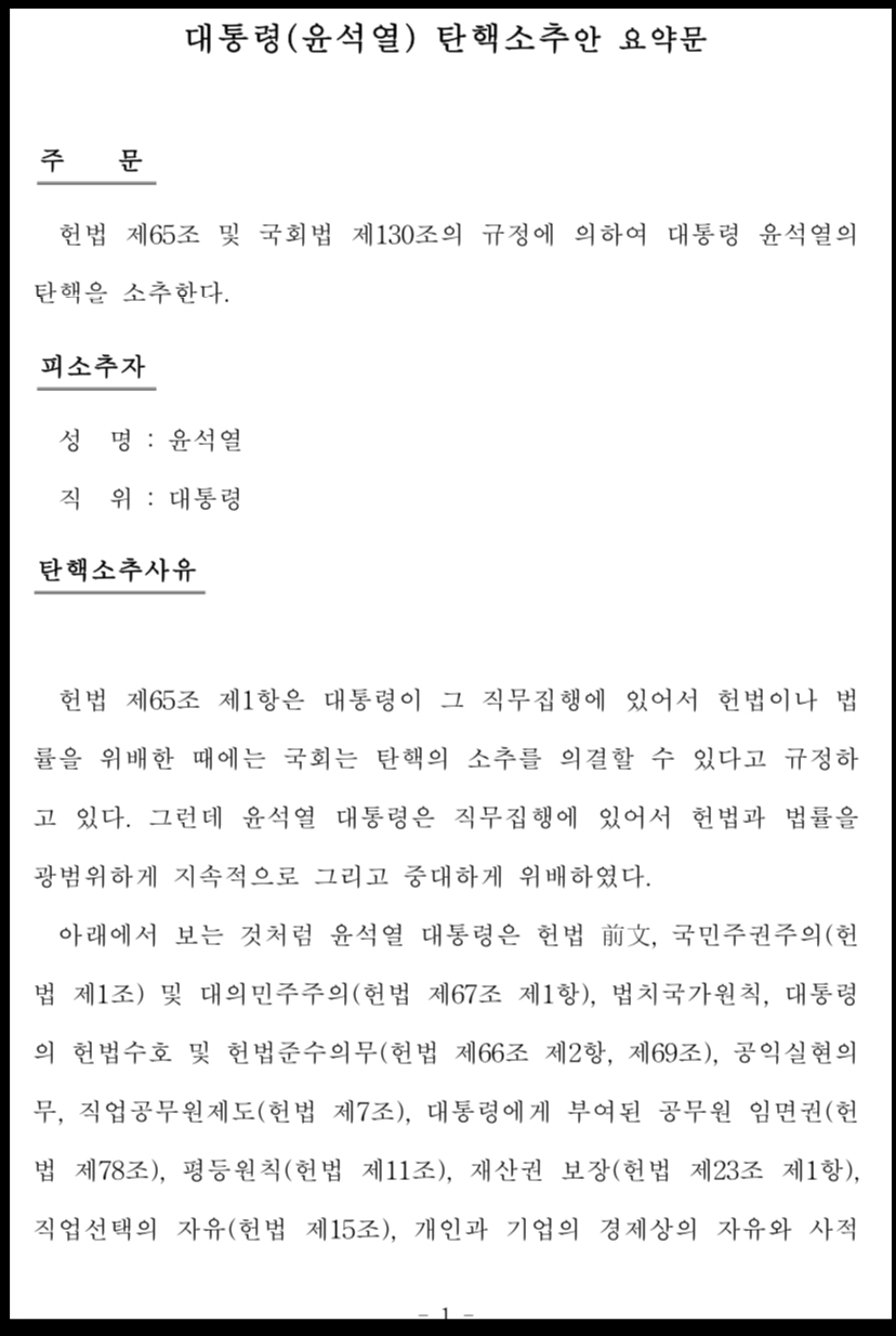헌법 제65조 및 국회법 제130조의 규정에 의하여 대통령 윤석열의 탄핵을 소추한다.
