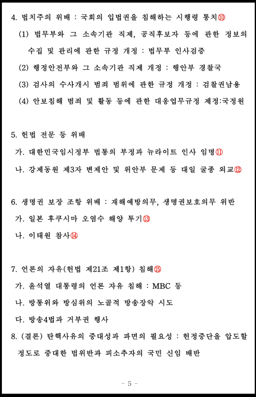 헌법 제65조 제1항은 대통령이 그 직무집행에 있어서 헌법이나 법률을 위배한 때에는 국회는 탄핵의 소추를 의결할 수 있다고 규정하고 있다. 그런데 윤석열 대통령은 직무집행에 있어서 헌법과 법률을 광범위하게 지속적으로 그리고 중대하게 위배하였다.
