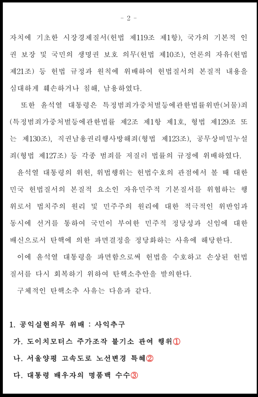 구체적 사유로는 도이치모터스 주가조작 불기소 관여 행위, 서울·양평 고속도로 노선변경 특혜, 대통령 배우자의 명품 가방 수수, 대통령 집무실 및 관저 이전 경위 등과 관련한 사익추구, 대통령의 법률안 거부권 남용, 채해병 사망사건 축소수사 외압 및 은폐 시도, 세관 마약 수사 외압 직권남용 등 15가지를 꼽았습니다.