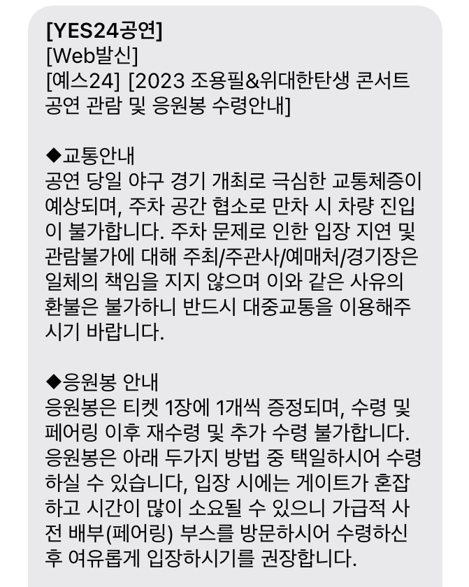 또한, 예스24티켓에서는 공연과 관련한 공지사항을 공개했는데요. K팝 아이돌 그룹들의 응원봉들은 대부분이 4만원을 넘지만 2023 조용필&위대한탄생 콘서트에서는 관객 여러분을 위한 특별한 선물 응원봉이 준비되어 있다는 것입니다. 관객 전원에게 증정되오니 별도의 응원도구는 준비하지 않으셔도 됩니다.