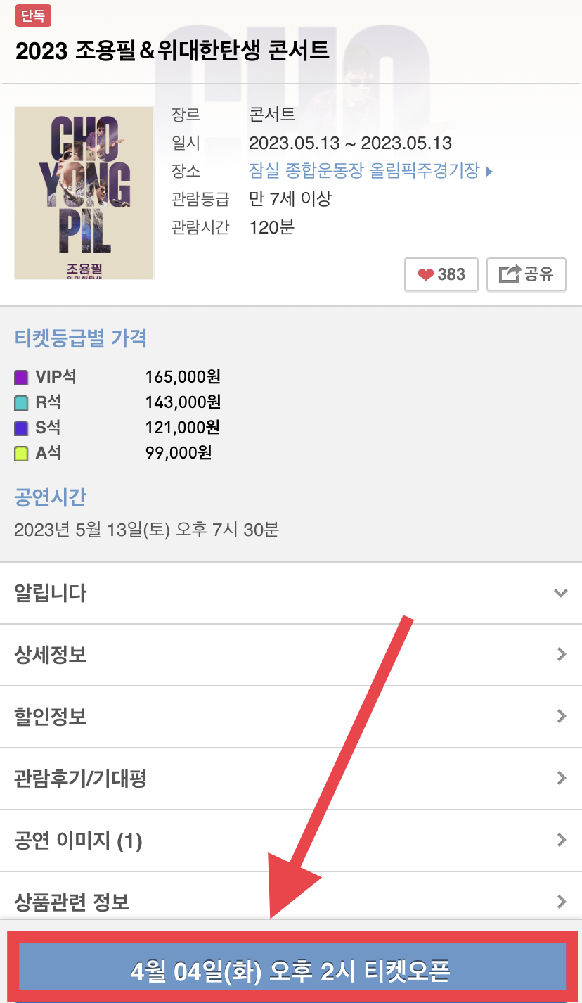 2023 조용필 콘서트는 공연기획사 인사이트엔터테인먼트에서 4월 4일(화) 오후 2시 예스24티켓 통해서 2023 조용필&위대한 탄생 공연 티켓을 단독으로 오픈한다고 했습니다. 경쟁률이 치열할 것으로 예상되므로 빠른 예매를 위해서는 예스24티켓에 접속하여 미리 회원가입을 진행해 두시면 신속하게 예매 진행하실 수 있을것입니다.