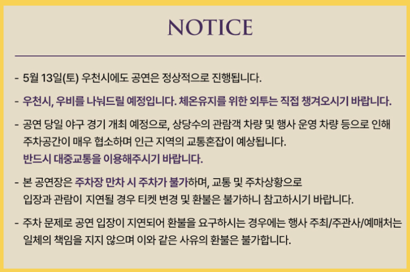 공연 당일 야구 경기 개최로 극심한 교통체증이 예상되며, 주차 공간 협소로 만차 시 차량 진입이 불가합니다. 주차 문제로 인한 입장 지연 및 관람불가에 대해 주최/주관사/예매처/경기장은 일체의 책임을 지지 않으며 이와 같은 사유의 환불은 불가하니 반드시 대중교통을 이용해주시기 바랍니다.