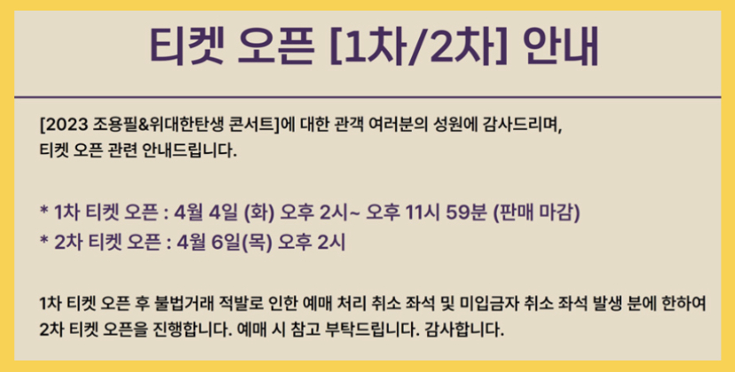 조용필 콘서트 티켓은 1차와 2차 두 번에 나뉘어 티켓을 오픈합니다. 1차 티켓 오픈은 4월 4일(화) 오후 2시부터 오후 11시 59분까지 판매를 마감하고, 2차 티켓 오픈은 4월 6일(목) 오후 2시에 합니다. 1차 티켓 오픈 후 불법거래 적발로 인한 예매 처리 취소 좌석 및 미입금자 취슈 좌석 발생 분에 한하여 2차 티켓 오픈을 진행하는 것이니 예매 시 참고하시기 바랍니다.