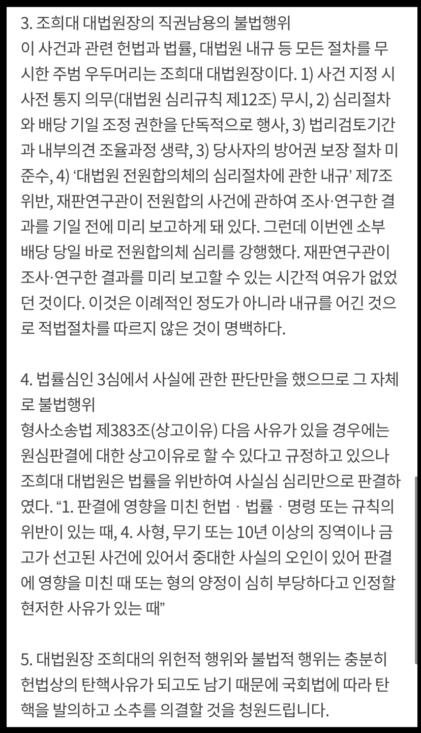 5. 대법원장 조희대의 위헌적 행위와 불법적 행위는 충분히 헌법상의 탄핵사유가 되고도 남기 때문에 국회법에 따라 탄핵을 발의하고 소추를 의결할 것을 청원드립니다.