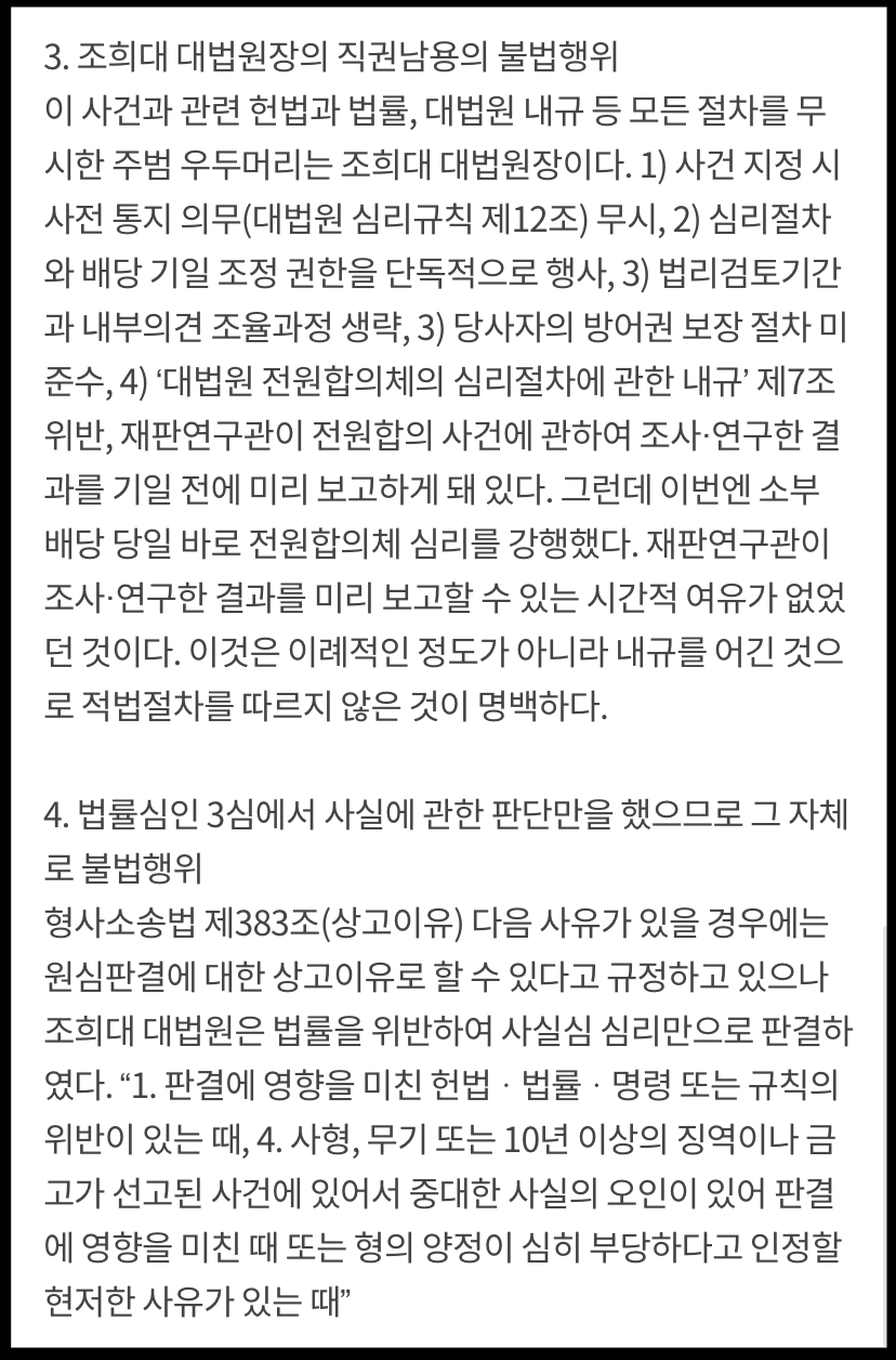 이 사건과 관련 헌법과 법률, 대법원 내규 등 모든 절차를 무시한 주범 우두머리는 조희대 대법원장이다. 1) 사건 지정 시 사전 통지 의무(대법원 심리규칙 제12조) 무시, 2) 심리절차와 배당 기일 조정 권한을 단독적으로 행사, 3) 법리검토기간과 내부의견 조율과정 생략, 3) 당사자의 방어권 보장 절차 미준수, 4) ‘대법원 전원합의체의 심리절차에 관한 내규’ 제7조 위반, 재판연구관이 전원합의 사건에 관하여 조사·연구한 결과를 기일 전에 미리 보고하게 돼 있다. 그런데 이번엔 소부 배당 당일 바로 전원합의체 심리를 강행했다. 재판연구관이 조사·연구한 결과를 미리 보고할 수 있는 시간적 여유가 없었던 것이다. 이것은 이례적인 정도가 아니라 내규를 어긴 것으로 적법절차를 따르지 않은 것이 명백하다.