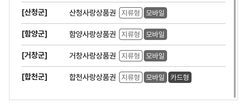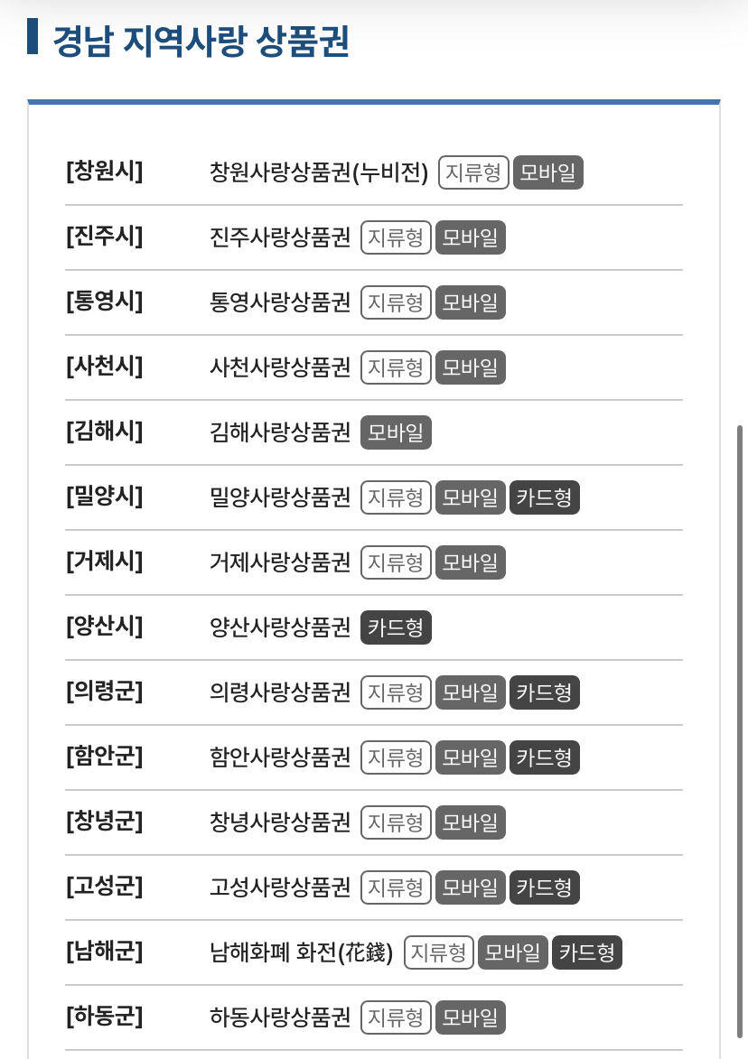창원사랑상품권, 진주, 통영, 사천, 김해, 밀양, 거제, 양산, 의령, 함안, 창녕, 고성사랑상품권, 남해화폐화전, 하동, 산청, 함양, 거창, 합천사랑상품권