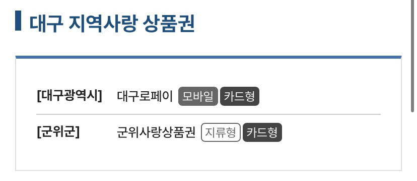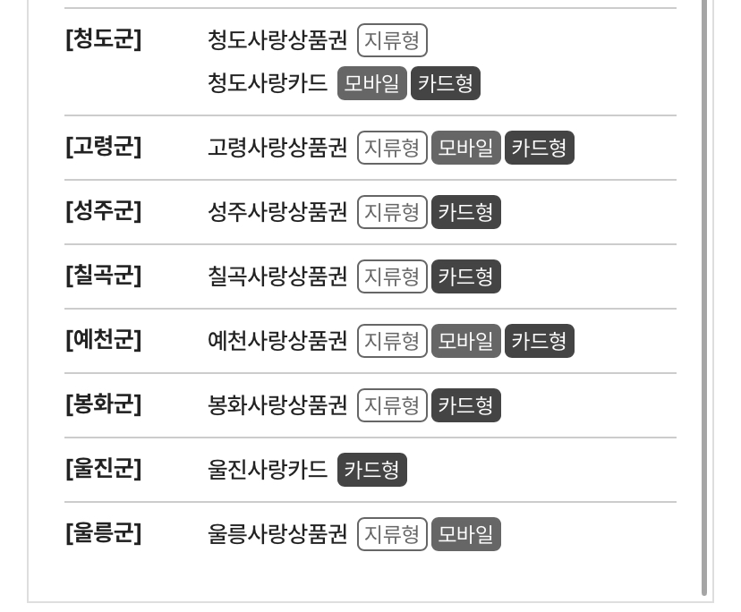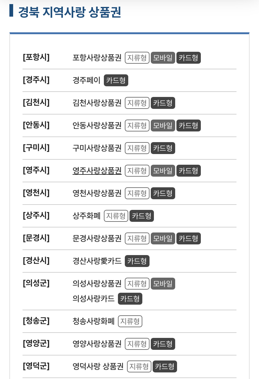 포항사랑상품권, 경주페이, 김천사랑상품권, 안동, 구미, 영주, 영천사랑상품권, 상주화폐, 문경사랑상품권, 경산사랑애카드, 의성사랑상품권, 청송사랑상품권, 영양, 영덕, 청도, 고령, 성주, 칠곡, 예천, 봉화, 울진, 울릉사랑상품권