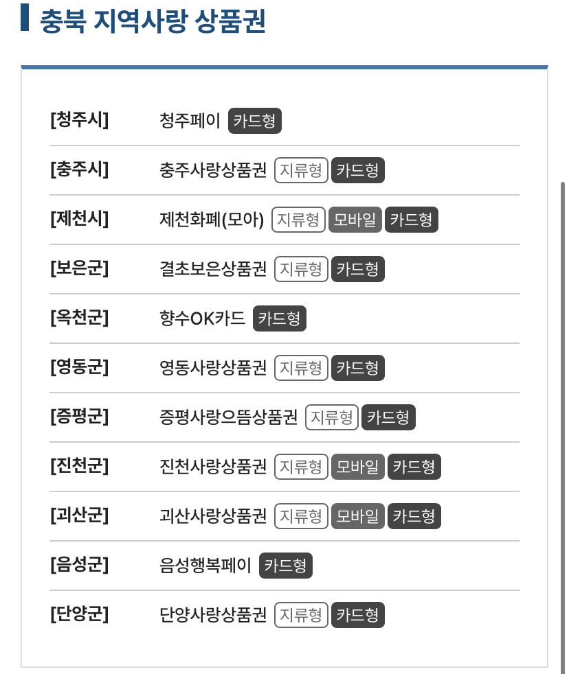 청주페이, 충주사랑상품권, 제천화폐, 결초보은상품권, 향수OK카드, 연동사랑상품권, 증평사랑으뜸상품권, 진천사랑상품권, 괴산사랑상품권, 음성행복페이, 단양사랑상품권
