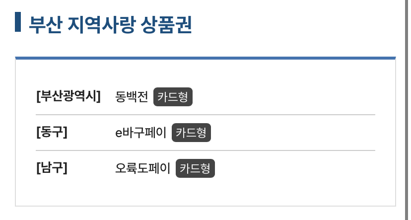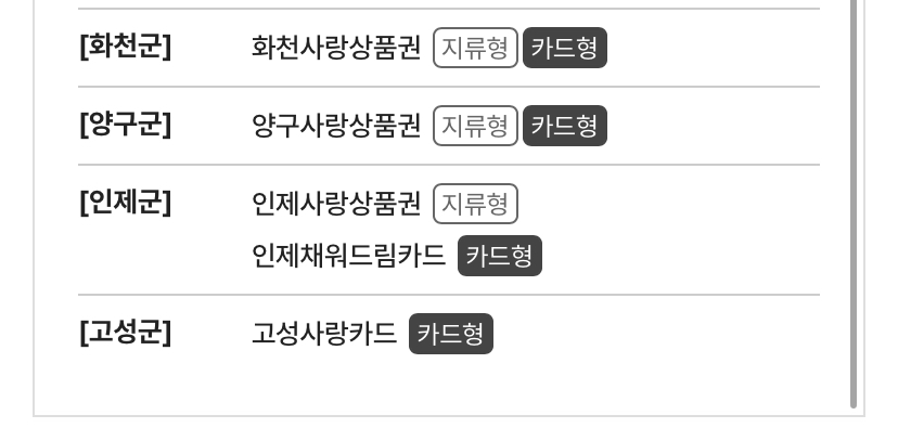 강원상품권, 춘천사랑상품권, 원주사랑상품권, 강릉페이, 동해사랑상품권, 동해페이, 탄탄페이, 속초사랑상품권, 삼척사랑상품권, 홍천사랑상품권, 횡성사랑카드, 영월별빛고운카드, 평창사랑상품권, 정선아리랑상품권, 철원사랑상품권, 화천사랑상푼권, 양구사랑상품권, 인제사랑상품권, 고성사랑카드