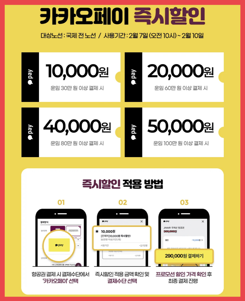 항공권 결제 시 결제수단에서 카카오페이를 선택 하시고, 즉시할인 적용 금액 확인 및 결제수단을 선택합니다. 그런 다음 프로모션 할인 가격 확인 후 최종결제를 진행하시면 됩니다.