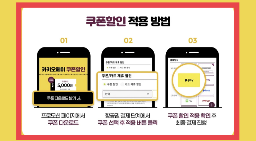 카카오페이 쿠폰을 다운받아 항공권 결제단계에서 쿠폰 선택 후 적용 버튼을 클릭하면 쿠폰 할인이 적용되어 최종 결제 진행하실 수 있습니다.