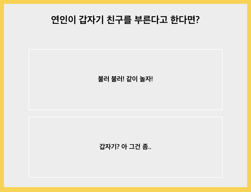 첫 번째 질문은 연인이 갑자기 친구를 부른다고 한다면이란 질문입니다. 저는 남자친구의 친구들과도 어울리는 것을 좋아하는 편이라서 부르라고 하면서 같이 놀자고 할 것 같습니다. 그런 경우도 종종 있었구요. SNS 맞팔 친구를 맺기도 할 정도로 두텁게 치내는 편입니다.