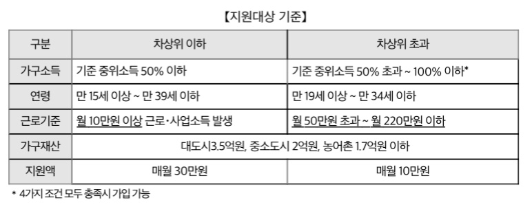 • 지원 대상: 연령, 소득기준, 가구소득, 가구재산 4가지를 모두 총족한 청년을 지원합니다.